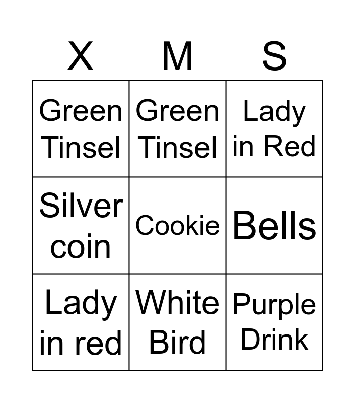 This bingo card has a free space and 12 words: Man with a hat, Silver Coin, Purple Drink, Bells, Green Tinsel, Lady in Red, White Bird, Rhymes with Banter, Green Tinsel, Silver coin, Lady in red and Brown Car.