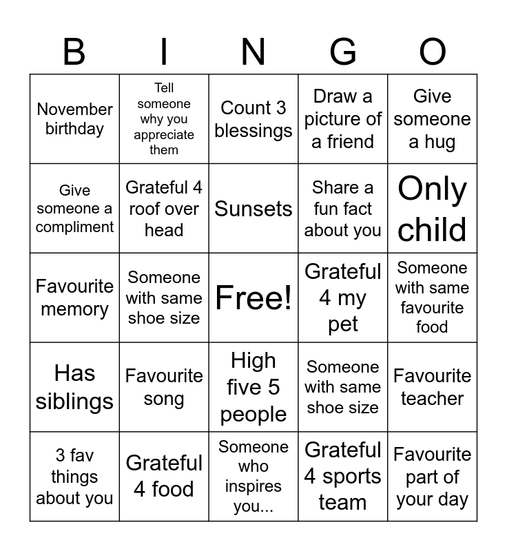 This bingo card has a free space and 24 words: Favourite song, Grateful 4 food, Sunsets, 3 fav things about you, Give someone a hug, November birthday, Give someone a compliment, Tell someone why you appreciate them, Grateful 4 my pet, High five 5 people, Share a fun fact about you, Favourite memory, Someone with same shoe size, Favourite teacher, Grateful 4 roof over head, Grateful 4 sports team, Someone with same favourite food, Count 3 blessings, Only child, Someone with same shoe size, Favourite part of your day, Has siblings, Draw a picture of a friend and Someone who inspires you....