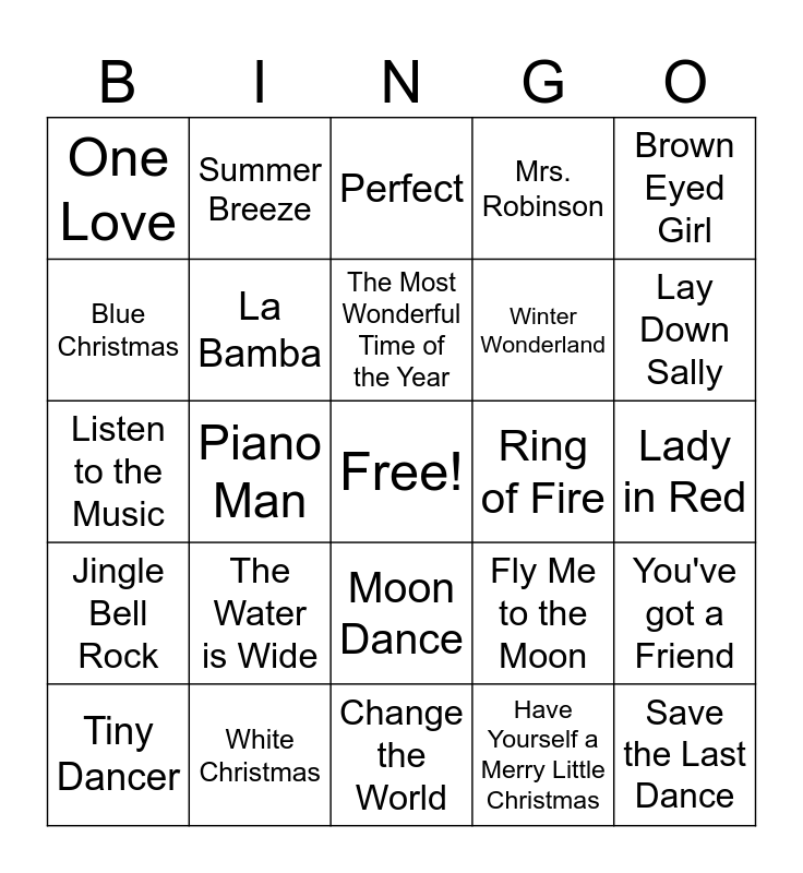 This bingo card has a free space and 24 words: The Water is Wide, White Christmas, The Most Wonderful Time of the Year, Tiny Dancer, Brown Eyed Girl, One Love, Blue Christmas, Summer Breeze, Ring of Fire, Moon Dance, Winter Wonderland, Listen to the Music, Fly Me to the Moon, You've got a Friend, La Bamba, Have Yourself a Merry Little Christmas, Lady in Red, Perfect, Lay Down Sally, Piano Man, Save the Last Dance, Jingle Bell Rock, Mrs. Robinson and Change the World.