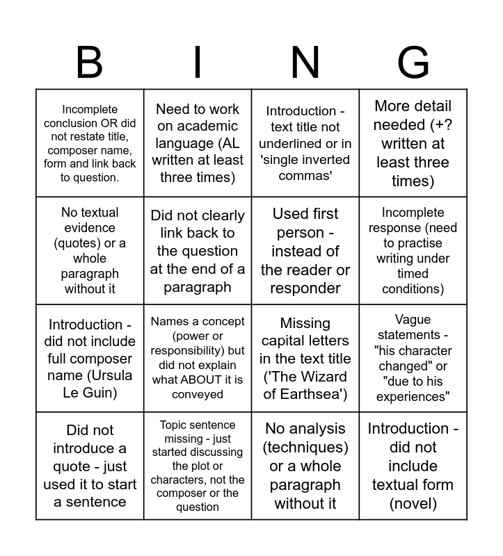 This bingo card has 16 words: Topic sentence missing - just started discussing the plot or characters, not the composer or the question, Vague statements - "his character changed" or "due to his experiences", Introduction - text title not underlined or in 'single inverted commas', Incomplete conclusion OR did not restate title, composer name, form and link back to question., Introduction - did not include full composer name (Ursula Le Guin), Need to work on academic language (AL written at least three times), Missing capital letters in the text title ('The Wizard of Earthsea'), No analysis (techniques) or a whole paragraph without it, No textual evidence (quotes) or a whole paragraph without it, Did not clearly link back to the question at the end of a paragraph, Did not introduce a quote - just used it to start a sentence, More detail needed (+? written at least three times), Names a concept (power or responsibility) but did not explain what ABOUT it is conveyed, Incomplete response (need to practise writing under timed conditions), Used first person - instead of the reader or responder and Introduction - did not include textual form (novel).