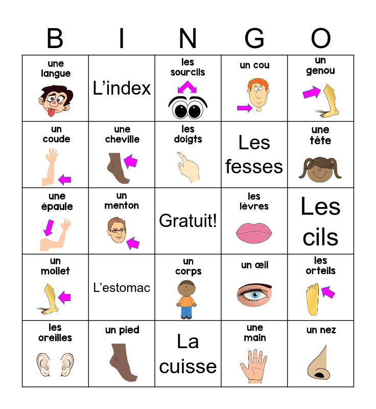 This bingo card has 28 images, a free space and 7 words: Les fesses, Les cils, Les dents, La cuisse, L’estomac, L’index and Le cerveau.