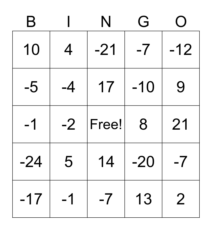 This bingo card has a free space and 24 words: 5, -1, 17, -17, -12, 10, -5, 4, 8, 14, -10, -1, -20, -7, -4, 13, 21, -21, 9, -2, 2, -24, -7 and -7.