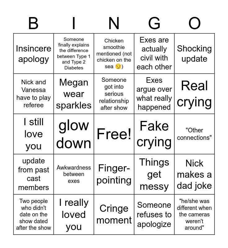 This bingo card has a free space and 33 words: random fill-in segments because no one got married, glow up, glow down, male contestant wearing no socks, update from past cast members, Megan wear sparkles, Shocking update, Two people who didn't date on the show dated after the show, Someone finally explains the difference between Type 1 and Type 2 Diabetes, Someone got married after the show, Someone got into serious relationship after show, Chicken smoothie mentioned (not chicken on the sea 😏), Pod Squad appearance, Kacie tries to gaslights Patrick again, Fake crying, Real crying, I really loved you, I still love you, Awkwardness between exes, Things get messy, Finger-pointing, Sincere apology, Insincere apology, "Other connections", Cringe moment, "he/she was different when the cameras weren't around", Exes are actually civil with each other, Exes argue over what really happened, Nick and Vanessa have to play referee, Nick makes a dad joke, Someone reflects after watching the season back, Someone refuses to apologize and "to be honest".