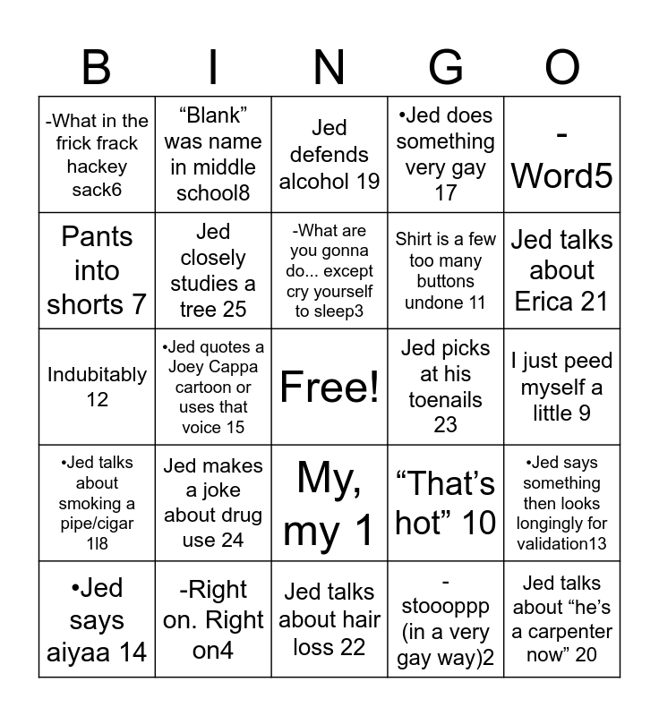 This bingo card has a free space and 26 words: My, my 1, - stoooppp (in a very gay way)2, -What are you gonna do... except cry yourself to sleep3, -Right on. Right on4, -Word5, -What in the frick frack hackey sack6, Pants into shorts 7, “Blank” was name in middle school8, I just peed myself a little 9, “That’s hot” 10, Shirt is a few too many buttons undone 11, Indubitably 12, •Jed says something then looks longingly for validation13, •Jed says aiyaa 14, •Jed quotes a Joey Cappa cartoon or uses that voice 15, •Jed does something mildly gay 16, •Jed does something very gay 17, •Jed talks about smoking a pipe/cigar 1l8, Jed defends alcohol 19, Jed talks about “he’s a carpenter now” 20, Jed talks about Erica 21, Jed talks about hair loss 22, Jed picks at his toenails 23, Jed makes a joke about drug use 24, Jed closely studies a tree 25 and Jed references marvel movie 26.