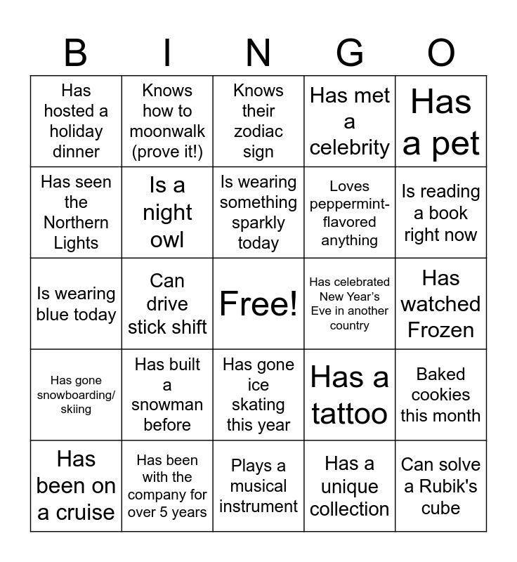 This bingo card has a free space and 24 words: Has built a snowman before, Has been with the company for over 5 years, Is wearing something sparkly today, Has been on a cruise, Has a pet, Has hosted a holiday dinner, Has seen the Northern Lights, Knows how to moonwalk (prove it!), Has celebrated New Year’s Eve in another country, Has gone ice skating this year, Loves peppermint-flavored anything, Is wearing blue today, Has a tattoo, Baked cookies this month, Is a night owl, Has a unique collection, Has watched Frozen, Knows their zodiac sign, Is reading a book right now, Can drive stick shift, Can solve a Rubik's cube, Has gone snowboarding/ skiing, Has met a celebrity and Plays a musical instrument.