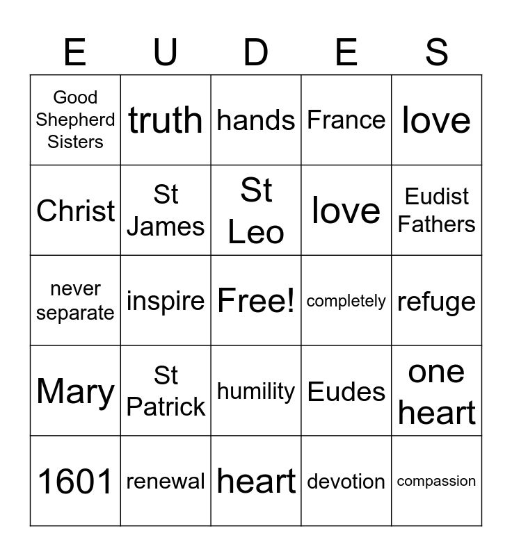This bingo card has a free space and 27 words: Eudes, devoted, love, heart, Christ, hands, truth, Mary, completely, one heart, never separate, France, 1601, renewal, Eudist Fathers, love, St James, St Leo, St Patrick, Good Shepherd Sisters, refuge, devotion, inspire, compassion, humility, love and missionaries.