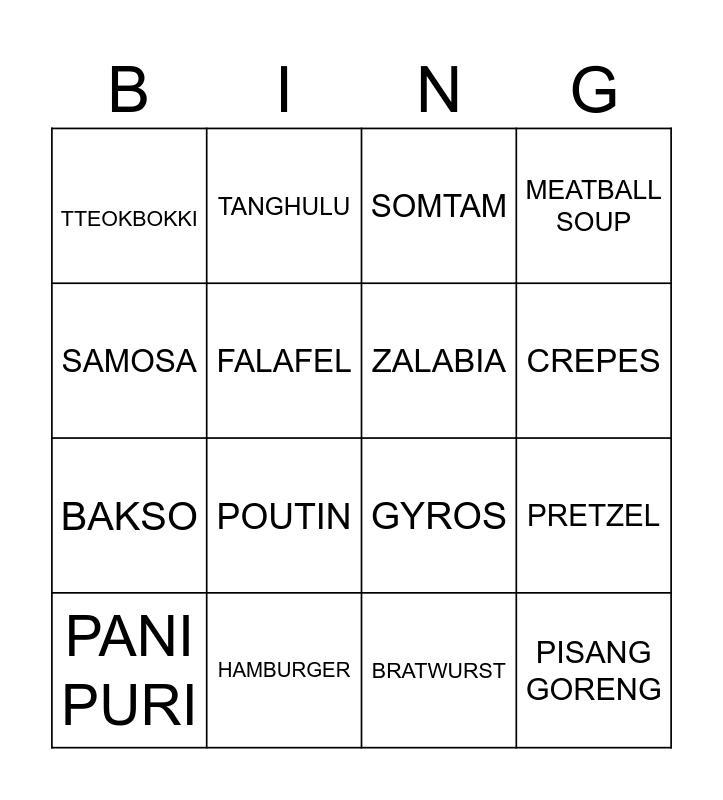 This bingo card has 30 words: CROISANT, PIZZA, PRETZEL, WAFFLE, TTEOKBOKKI, SOMTAM, ZALABIA, KEBAB, HAMBURGER, CHURROS, BRATWURST, PANI PURI, TAKOYAKI, SUSHI, POUTIN, DOUGHNOUT, BAHN MI, PISANG GORENG, TACOS, SAMOSA, GYROS, SPRING ROLL, TANGHULU, BAKSO, FALAFEL, MEATBALL SOUP, NACHOS, FISH & CHIP, CREPES and PASTEL DE NATA.