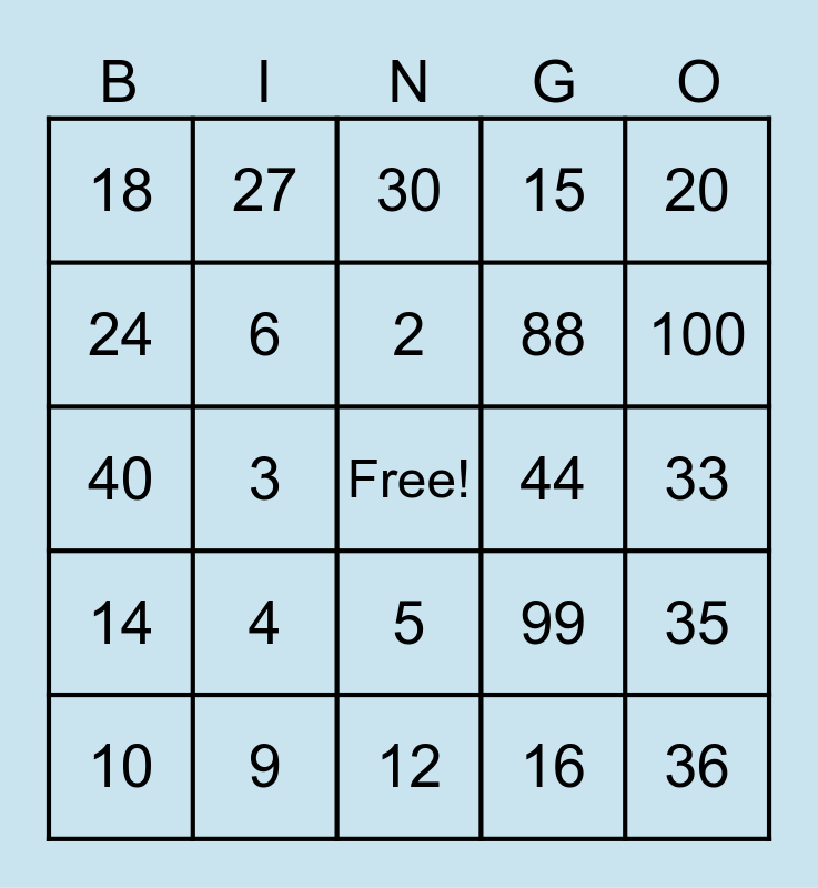 This bingo card has a free space and 31 words: 12, 22, 3, 45, 18, 30, 6, 99, 44, 16, 33, 36, 25, 21, 100, 50, 35, 4, 14, 5, 20, 77, 10, 27, 88, 24, 15, 40, 9, 2 and 28.