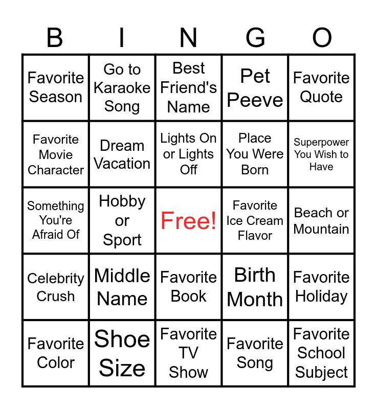 This bingo card has a free space and 29 words: Favorite Color, Favorite Food, Hobby or Sport, Target Country to Visit, Favorite Season, Best Friend's Name, Dream Vacation, Middle Name, Favorite Ice Cream Flavor, Shoe Size, Beach or Mountain, Favorite School Subject, Favorite TV Show, Favorite Song, Superpower You Wish to Have, Pet's Name, Favorite Book, Celebrity Crush, Favorite Quote, Something You're Afraid Of, Birth Month, Favorite Movie, Place You Were Born, Favorite Movie Character, Pet Peeve, Go to Karaoke Song, Favorite Holiday, Lights On or Lights Off and Sing or Dance.