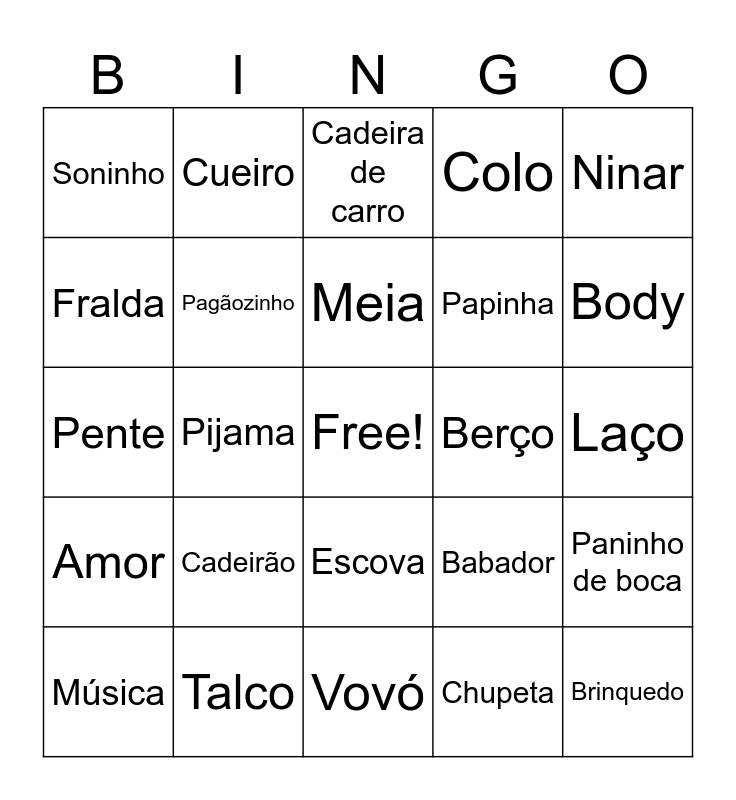 This bingo card has a free space and 24 words: Cadeirão, Talco, Meia, Música, Ninar, Soninho, Fralda, Cueiro, Berço, Escova, Papinha, Pente, Babador, Paninho de boca, Pagãozinho, Chupeta, Laço, Cadeira de carro, Body, Pijama, Brinquedo, Amor, Colo and Vovó.
