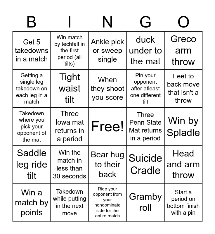 This bingo card has a free space and 24 words: Win the match in less than 30 seconds, Takedown while putting in the next move, When they shoot you score, Win a match by points, Greco arm throw, Get 5 takedowns in a match, Getting a single leg takedown on each leg in a match, Win match by techfall in the first period (all tilts), Three Penn State Mat returns in a period, Bear hug to their back, Pin your opponent after atleast one different tilt, Takedown where you pick your opponent of the mat, Suicide Cradle, Head and arm throw, Tight waist tilt, Gramby roll, Win by Spladle, Ankle pick or sweep single, Feet to back move that isn't a throw, Three Iowa mat returns in a period, Start a period on bottom finish with a pin, Saddle leg ride tilt, duck under to the mat and Ride your opponent from your nondominate side for the entire match.