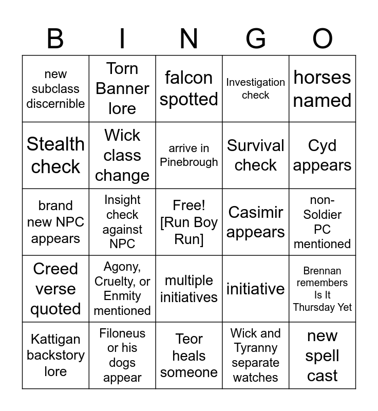 This bingo card has a free space and 34 words: taking watch, Wick and Tyranny separate watches, Wick cries, group was followed, Creed verse quoted, Wick class change, horses named, Kattigan backstory lore, Torn Banner lore, arrive in Timmony, arrive in Pinebrough, falcon spotted, non-falcon bird spotted, truth of Creed explained to others, Casimir appears, Cyd appears, Filoneus or his dogs appear, brand new NPC appears, Agony, Cruelty, or Enmity mentioned, initiative, multiple initiatives, no initiative, new subclass discernible, non-Soldier PC mentioned, Teor heals someone, new spell cast, Investigation check, Perception check, Survival check, Stealth check, Insight check against PC, Insight check against NPC, Brennan remembers Is It Thursday Yet and Brennan forgets Is it Thursday Yet.