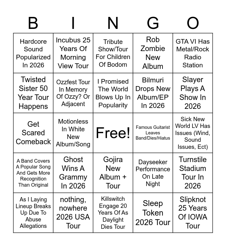 This bingo card has a free space and 29 words: As I Laying Lineup Breaks Up Due To Abuse Allegations, Back To The Beginning Documentary In 2026, Motionless In White New Album/Song, Warped Tour Announces 4+ Shows For 2026, Hardcore Sound Popularized In 2026, Tribute Show/Tour For Children Of Bodom, Ozzfest Tour In Memory Of Ozzy? Or Adjacent, Ghost Wins A Grammy In 2026, Famous Guitarist Leaves Band/Dies/Hiatus, nothing, nowhere 2026 USA Tour, Sick New World LV Has Issues (Wind, Sound Issues, Ect), Slipknot 25 Years Of IOWA Tour, Killswitch Engage 20 Years Of As Daylight Dies Tour, Sleep Token 2026 Tour, Slayer Plays A Show In 2026, Downswing Blows Up In Popularity, Gojira New Album + Tour, A Band Covers A Popular Song And Gets More Recognition Than Original, GTA VI Has Metal/Rock Radio Station, Get Scared Comeback, Dayseeker Performance On Late Night, Vocalist Gets Canceled, Bilmuri Drops New Album/EP In 2026, Twisted Sister 50 Year Tour Happens, Rob Zombie New Album, Incubus 25 Years Of Morning View Tour, Turnstile Stadium Tour In 2026, I Promised The World Blows Up In Popularity and A Band Plays Dennys/Taco Bells/Sheetz In 2026 - BONUS IF ITS A TOUR.