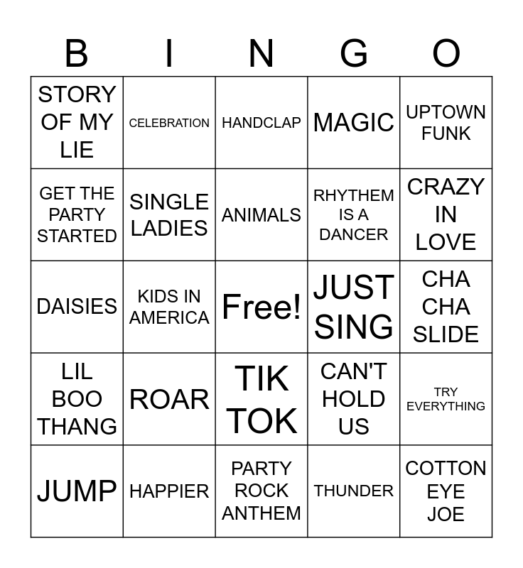 This bingo card has a free space and 50 words: JUST THE WAY YOU ARE, COTTON EYE JOE, FIREWORK, PARTY ROCK ANTHEM, ROAR, STYLE, CELEBRATION, SHUT UP AND DANCE, GET THE PARTY STARTED, TIMBER, SINGLE LADIES, MAGIC, TRY EVERYTHING, CAN'T HOLD US, CALL ME MAYBE, ON TOP OF THE WORLD, ANIMALS, JUST SING, GIRL ON FIRE, UPTOWN FUNK, KIDS IN AMERICA, THUNDER, STORY OF MY LIE, RHYTHEM IS A DANCER, BEAT IT, JUST LIKE FIRE, CRAZY IN LOVE, SING, HANDCLAP, TIK TOK, JUST DANCE, SENORITA, YOU BELONG WITH ME, SWEET CAROLINA, HAPPIER, LIPS ARE MOVIN, SUNROOF, FRIEND LIKE ME, I LIKE TO MOVE IT, CHA CHA SLIDE, DYNAMITE, HAPPY, HEAT WAVES, GOLDEN, JUMP, DAISIES, ESPRESSO, BABY SHARK, LIL BOO THANG and STAY.
