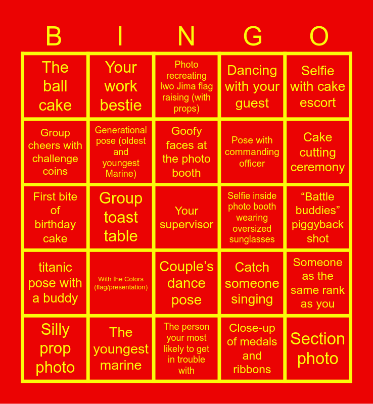 This bingo card has 41 words: In front of the Marine Corps birthday cake, With the Colors (flag/presentation), Free!, Pose with commanding officer, Section photo, titanic pose with a buddy, Group toast table, Officer and enlisted dress blues, Dancing with your guest, “Battle buddies” piggyback shot, Group cheers with challenge coins, Generational pose (oldest and youngest Marine), Goofy faces at the photo booth, Close-up of medals and ribbons, Cake cutting ceremony, First bite of birthday cake, Display challenge coin with guest, Photo recreating Iwo Jima flag raising (with props), Picture with someone first time at a ball, Selfie with cake escort, Silly prop photo, Photo with the event’s master of ceremonies, Couple’s dance pose, Selfie inside photo booth wearing oversized sunglasses, Your date, The oldest marine, The youngest marine, Marine and guest taking a selfie on dance floor, Catch someone singing, With a bartender, An officer, Your work bestie, Your supervisor, Someone wearing glasses, Someone as the same rank as you, The ball cake, With SgtMaj selfie, The person your most likely to get in trouble with, With CO selfie, With 1stSgt and With GOH selfie.