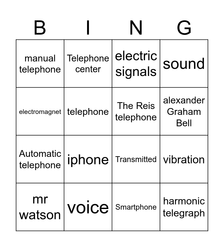 This bingo card has 16 words: voice, vibration, electric signals, manual telephone, Automatic telephone, Telephone center, Transmitted, Smartphone, electromagnet, telephone, mr watson, sound, iphone, alexander Graham Bell, The Reis telephone and harmonic telegraph.