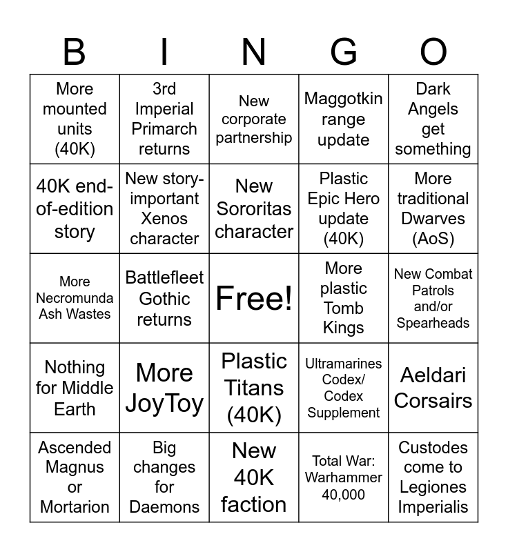 This bingo card has a free space and 27 words: Ultramarines Codex/ Codex Supplement, Primaris Vanguard Veterans and/or Jetbikes, Plastic Epic Hero update (40K), New 40K faction, 40K end-of-edition story, New corporate partnership, 3rd Imperial Primarch returns, Nothing for Middle Earth, More plastic Tomb Kings, Aeldari Corsairs, More Necromunda Ash Wastes, Maggotkin range update, Ascended Magnus or Mortarion, Big changes for Daemons, More traditional Dwarves (AoS), Plastic Talons of the Emperor (Horus Heresy), New story-important Xenos character, New Sororitas character, More JoyToy, More mounted units (40K), New Combat Patrols and/or Spearheads, Total War: Warhammer 40,000, Battlefleet Gothic returns, Custodes come to Legiones Imperialis, Plastic Titans (40K), Dark Angels get something and Update to paint range.
