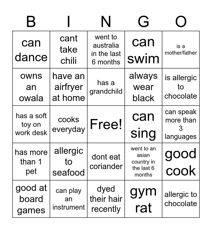This bingo card has a free space and 36 words: vegetarian, loves outdoor activities, owns jisufan, always wear black, allergic to chocolate, good at board games, cooks everyday, dont eat coriander, can swim, rent out their house, has more than 1 pet, have an airfryer at home, loves onions, good cook, has a soft toy on work desk, cant take chili, has a grandchild, can sing, can speak more than 3 languages, can dance, can play an instrument, went to australia in the last 6 months, gym rat, went to the US in the past 6 months, enjoys healthy eating, is a mother/father, allergic to seafood, dyed their hair recently, is allergic to chocolate, owns an owala, owns an office pet, owns a paperbunny, loves to play computer games, went to an asian country in the last 6 months, has a household pet and stays at home during the weekends.