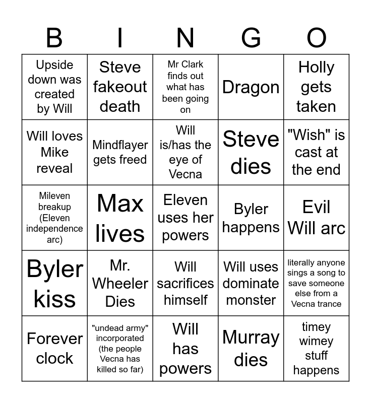 This bingo card has a free space and 24 words: Mr. Wheeler Dies, "undead army" incorporated (the people Vecna has killed so far), Will is/has the eye of Vecna, Forever clock, Holly gets taken, Upside down was created by Will, Will loves Mike reveal, Steve fakeout death, Byler happens, Will sacrifices himself, Steve dies, Mileven breakup (Eleven independence arc), Will uses dominate monster, literally anyone sings a song to save someone else from a Vecna trance, Mindflayer gets freed, Murray dies, Evil Will arc, Mr Clark finds out what has been going on, "Wish" is cast at the end, Max lives, timey wimey stuff happens, Byler kiss, Dragon and Will has powers.