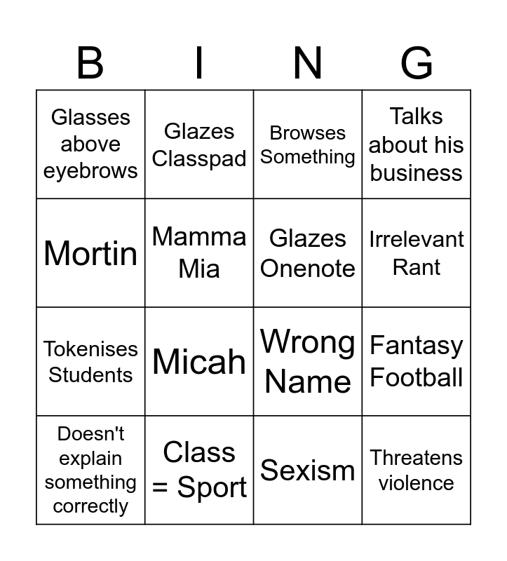 This bingo card has 20 words: Fantasy Football, Touches/Really close to student, Browses Something, Mentions his past, Doesn't explain something correctly, Mortin, Class = Sport, Glasses above eyebrows, Tokenises Students, Glazes Classpad, Micah, Wrong Name, Mamma Mia, Threatens violence, Glazes Onenote, Sarah, Irrelevant Rant, Talks about his business, Sexism and Assigns Seating.