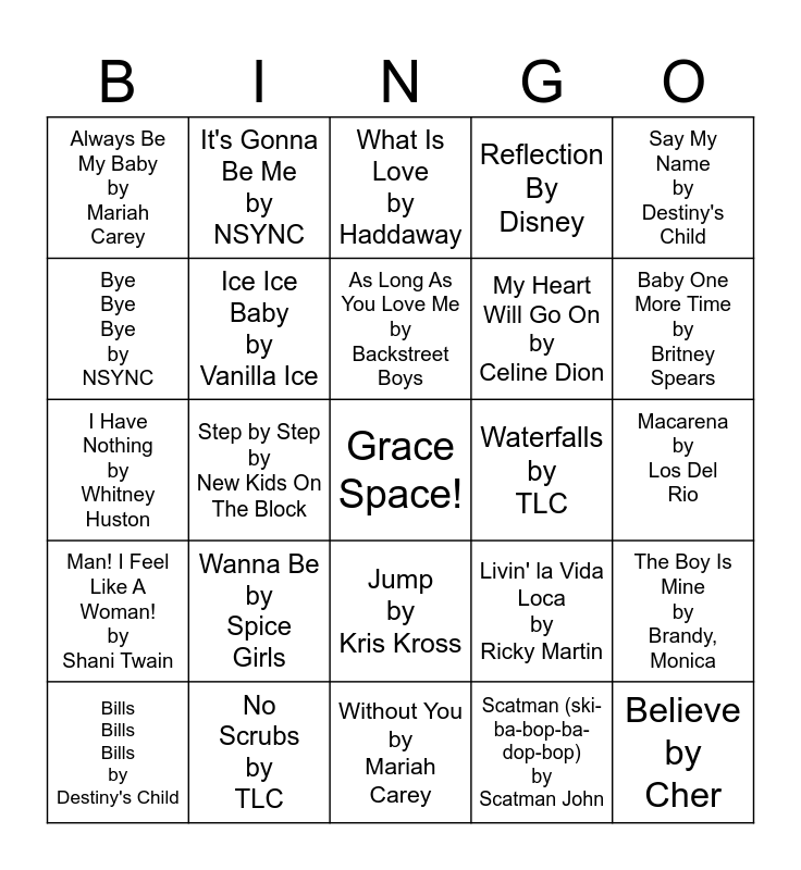 This bingo card has a free space and 24 words: Wanna Be by Spice Girls, No Scrubs by TLC, As Long As You Love Me by Backstreet Boys, Bills Bills Bills by Destiny's Child, Say My Name by Destiny's Child, Always Be My Baby by Mariah Carey, Bye Bye Bye by NSYNC, It's Gonna Be Me by NSYNC, Waterfalls by TLC, Jump by Kris Kross, My Heart Will Go On by Celine Dion, I Have Nothing by Whitney Huston, Livin' la Vida Loca by Ricky Martin, The Boy Is Mine by Brandy, Monica, Ice Ice Baby by Vanilla Ice, Scatman (ski-ba-bop-ba-dop-bop) by Scatman John, Macarena by Los Del Rio, What Is Love by Haddaway, Baby One More Time by Britney Spears, Step by Step by New Kids On The Block, Believe by Cher, Man! I Feel Like A Woman! by Shani Twain, Reflection By Disney and Without You by Mariah Carey.