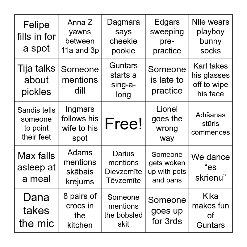This bingo card has a free space and 24 words: Adams mentions skābais krējums, 8 pairs of crocs in the kitchen, Guntars starts a sing-a-long, Dana takes the mic, Nile wears playboy bunny socks, Felipe fills in for a spot, Tija talks about pickles, Anna Z yawns between 11a and 3p, Lionel goes the wrong way, Darius mentions Dievzemīte Tēvzemīte, Someone is late to practice, Sandis tells someone to point their feet, Someone gets woken up with pots and pans, We dance “es skrienu”, Someone mentions dill, Someone goes up for 3rds, Adīšanas stūris commences, Dagmara says cheekie pookie, Karl takes his glasses off to wipe his face, Ingmars follows his wife to his spot, Kika makes fun of Guntars, Max falls asleep at a meal, Edgars sweeping pre-practice and Someone mentions the bobsled skit.