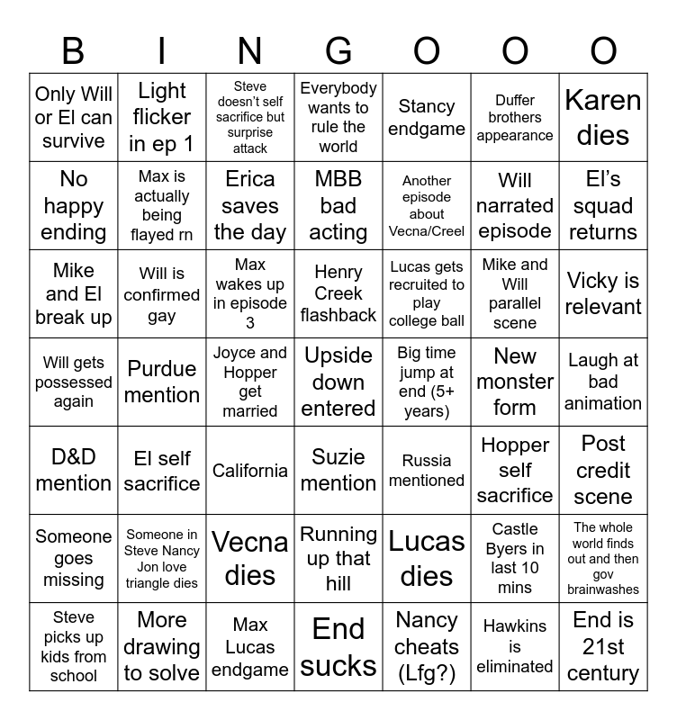 This bingo card has a free space and 48 words: Lucas dies, Will narrated episode, End sucks, Purdue mention, Max wakes up in episode 3, Laugh at bad animation, Light flicker in ep 1, More drawing to solve, Duffer brothers appearance, Suzie mention, Karen dies, Everybody wants to rule the world, Mike and Will parallel scene, Lucas gets recruited to play college ball, Someone goes missing, New monster form, No happy ending, El’s squad returns, Castle Byers in last 10 mins, Stancy endgame, Another episode about Vecna/Creel, Joyce and Hopper get married, Only Will or El can survive, Max is actually being flayed rn, The whole world finds out and then gov brainwashes, Erica saves the day, Vicky is relevant, Steve picks up kids from school, Henry Creek flashback, Will is confirmed gay, Hawkins is eliminated, Big time jump at end (5+ years), Post credit scene, Someone in Steve Nancy Jon love triangle dies, Will gets possessed again, Russia mentioned, Hopper self sacrifice, Mike and El break up, California, Vecna dies, D&D mention, End is 21st century, Steve doesn’t self sacrifice but surprise attack, Max Lucas endgame, MBB bad acting, Running up that hill, El self sacrifice and Nancy cheats (Lfg?).