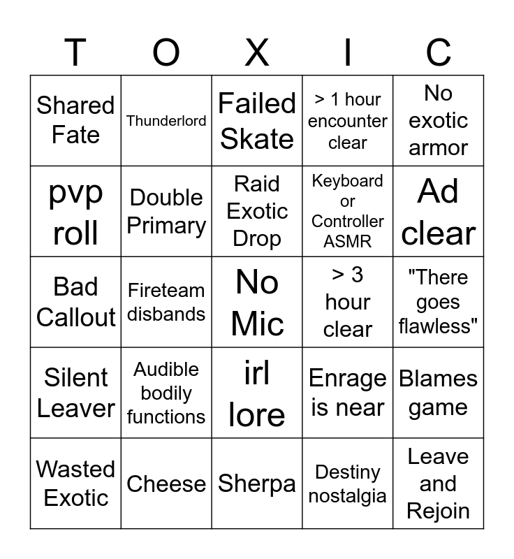 This bingo card has a free space and 24 words: Audible bodily functions, Cheese, Raid Exotic Drop, Wasted Exotic, No exotic armor, Shared Fate, pvp roll, Thunderlord, > 3 hour clear, irl lore, Keyboard or Controller ASMR, Bad Callout, Enrage is near, Blames game, Double Primary, Destiny nostalgia, "There goes flawless", Failed Skate, Ad clear, Fireteam disbands, Leave and Rejoin, Silent Leaver, > 1 hour encounter clear and Sherpa.