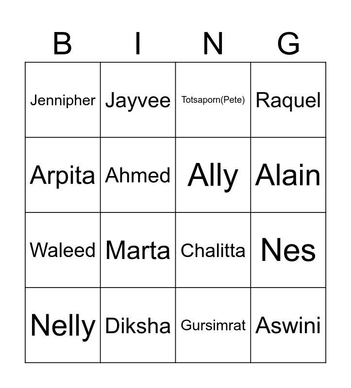 This bingo card has 54 words: Free!, Aswini, Lerato, Suzan, Mary, Aya, Raquel, Nolwazi, Ahmed, Joanna, Jennipher, Abeer, Aisha, Reem Semir, Jamie, Farida, Nelly, Waleed, Vinayak, Gursimrat, Hema, Huba, Diksha, Arpita, Nishtha, Jayvee, Abhishek, Jatin, Mayank, Shailly, Evonne, SunYoung(Sunny), Johnson, Zakiah, Totsaporn(Pete), Viven, Chalitta, Tom, Cayton, Ally, Qian(Tracy), Maggie, Min(Vera), Qi (Florence), Cheng Wei (Chennessy), Jane, Sherry, Gabriel, Alain, Nes, Marta, Leighton, Chandrika and Xiao Fan(Alita).