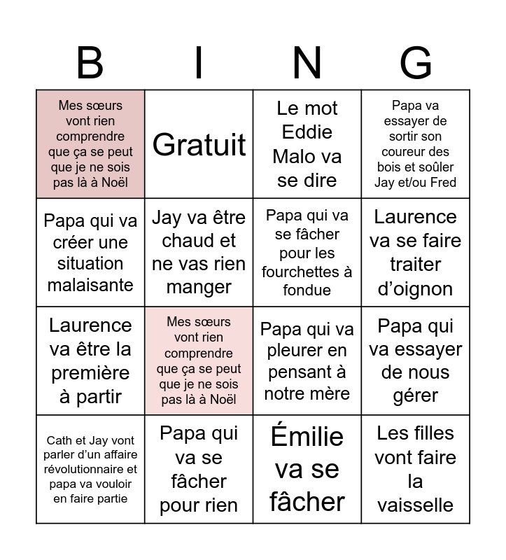 This bingo card has 16 words: Papa qui va se fâcher pour rien, Papa qui va essayer de nous gérer, Le mot Eddie Malo va se dire, Mes sœurs vont rien comprendre que ça se peut que je ne sois pas là à Noël, Laurence va être la première à partir, Gratuit, Papa qui va pleurer en pensant à notre mère, Émilie va se fâcher, Papa qui va créer une situation malaisante, Jay va être chaud et ne vas rien manger, Cath et Jay vont parler d’un affaire révolutionnaire et papa va vouloir en faire partie, Papa va essayer de sortir son coureur des bois et soûler Jay et/ou Fred, Mes sœurs vont rien comprendre que ça se peut que je ne sois pas là à Noël, Laurence va se faire traiter d’oignon, Papa qui va se fâcher pour les fourchettes à fondue and Les filles vont faire la vaisselle.