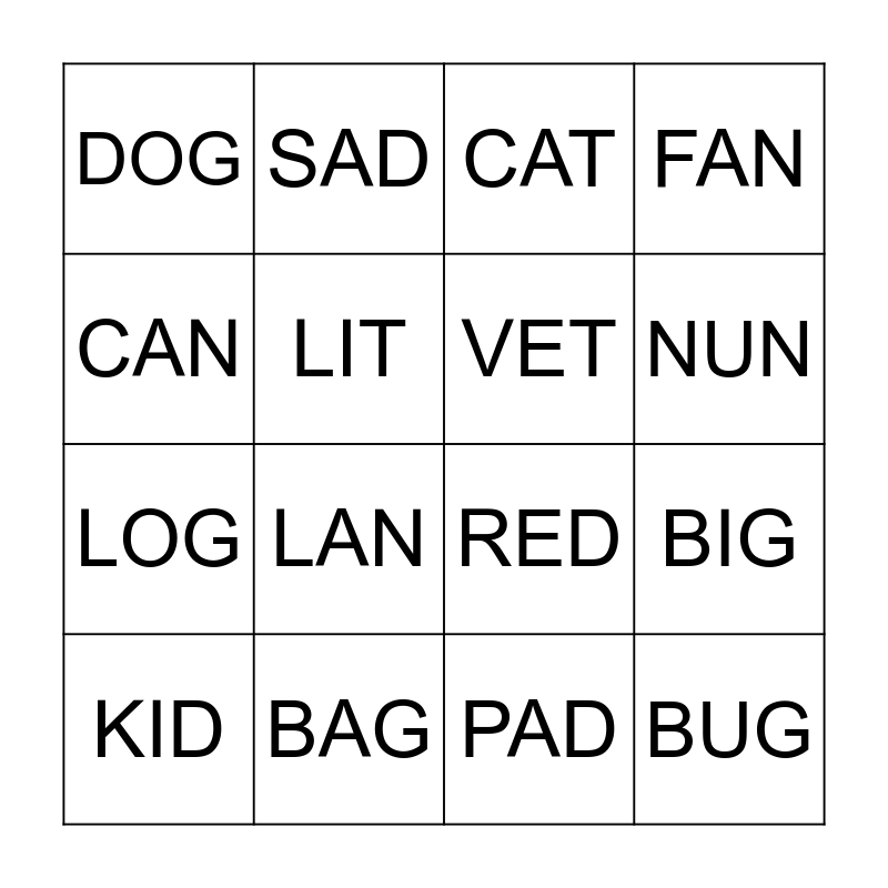 This bingo card has 16 words: BAG, BIG, CAT, DOG, LOG, SAD, RED, PAD, CAN, LIT, KID, FAN, LAN, NUN, VET and BUG.