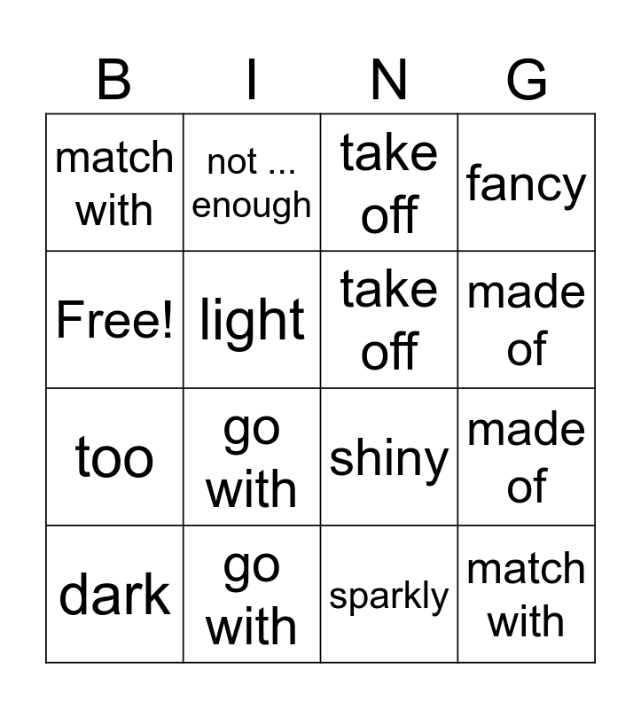 This bingo card has 16 words: go with, made of, take off, match with, too, not ... enough, shiny, sparkly, Free!, light, dark, fancy, go with, made of, take off and match with.