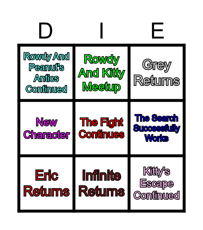 This bingo card has 9 words: Eric Returns, Grey Returns, Rowdy And Kitty Meetup, New Character, Rowdy And Peanut's Antics Continued, The Search Successfully Works, The Fight Continues, Kitty's Escape Continued and Infinite Returns.