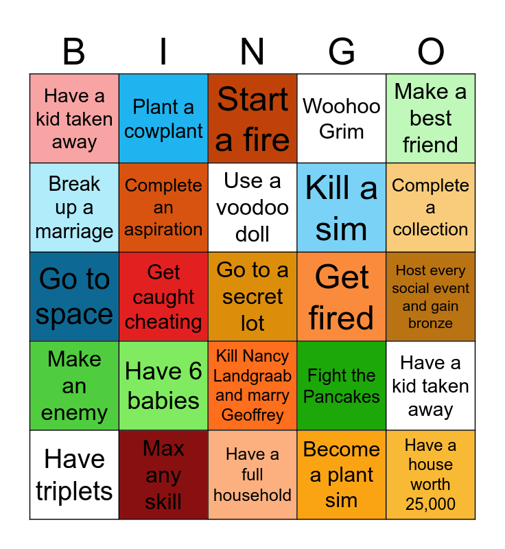 This bingo card has 30 words: Max any skill, Age up, Get caught cheating, Unlock and complete the grilled cheese aspiration, Have a kid taken away, Start a fire, Complete an aspiration, Kill Nancy Landgraab and marry Geoffrey, Get fired, Have a full household, Host every social event and gain bronze, Go to a secret lot, Become a plant sim, Have a house worth 25,000, Complete a collection, Pass out twice, Fight the Pancakes, Make an enemy, Have 6 babies, Make a best friend, Go to space, Make 3 emotional paintings, Plant a cowplant, Kill a sim, Break up a marriage, Woohoo Grim, Have a kid taken away, Have triplets, Use a voodoo doll and Become a plant sim.