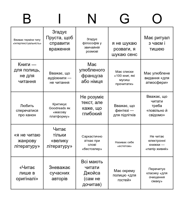 This bingo card has a free space and 24 words: Читає тільки «велику літературу», Зневажає сучасних авторів, Має улюбленого француза або німця, «Читає лише в оригіналі», Має ритуал з чаєм і тишею, Вживає терміни типу «інтертекстуальність», Книги — для полиць, не для читання, Згадує Пруста, щоб справити враження, Вважає, що фентезі — для підлітків, Саркастично зітхає при слові «бестселер», Має списки «100 книг, які мусиш прочитати», Любить сперечатися про канон, Називає себе «естетом», Не читає електронні книжки — «папір живий», Вважає, що аудіокниги — не читання, Має окрему полицю «для гостей», Вважає, що читати треба «повільно й свідомо», Згадує філософів у звичайній розмові, Має улюблене видання «для атмосфери», Критикує Goodreads як «масову платформу», Перечитує класику «для очищення смаку», «я не читаю жанрову літературу», я не шукаю розваги, я шукаю сенс and Всі мають читати Джойса (сам не дочитав).