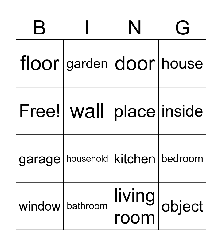 This bingo card has 16 words: bathroom, bedroom, door, floor, garage, garden, kitchen, living room, Free!, wall, window, house, household, inside, place and object.