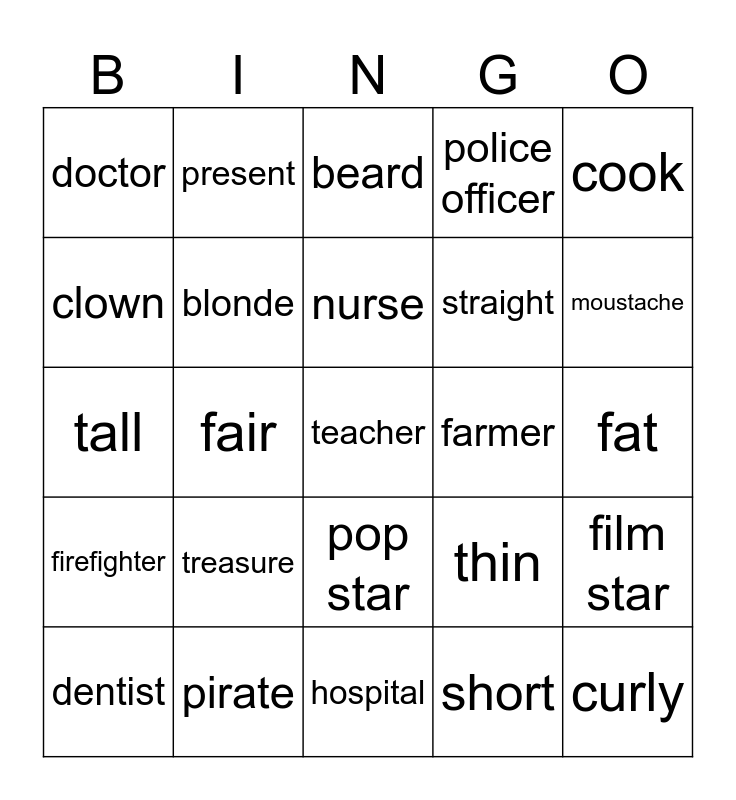 This bingo card has a free space and 24 words: treasure, pirate, nurse, dentist, cook, doctor, clown, present, farmer, pop star, straight, tall, thin, film star, blonde, short, fat, beard, moustache, fair, curly, firefighter, police officer and hospital.