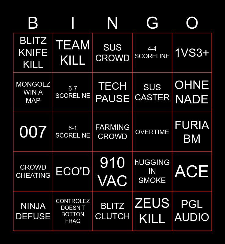 This bingo card has a free space and 24 words: ECO'D, CONTROLEZ DOESN'T BOTTON FRAG, TECH PAUSE, NINJA DEFUSE, 1VS3+, BLITZ KNIFE KILL, MONGOLZ WIN A MAP, TEAM KILL, OVERTIME, 910 VAC, SUS CASTER, 007, hUGGING IN SMOKE, ACE, 6-7 SCORELINE, ZEUS KILL, FURIA BM, SUS CROWD, OHNE NADE, 6-1 SCORELINE, PGL AUDIO, CROWD CHEATING, 4-4 SCORELINE and BLITZ CLUTCH.