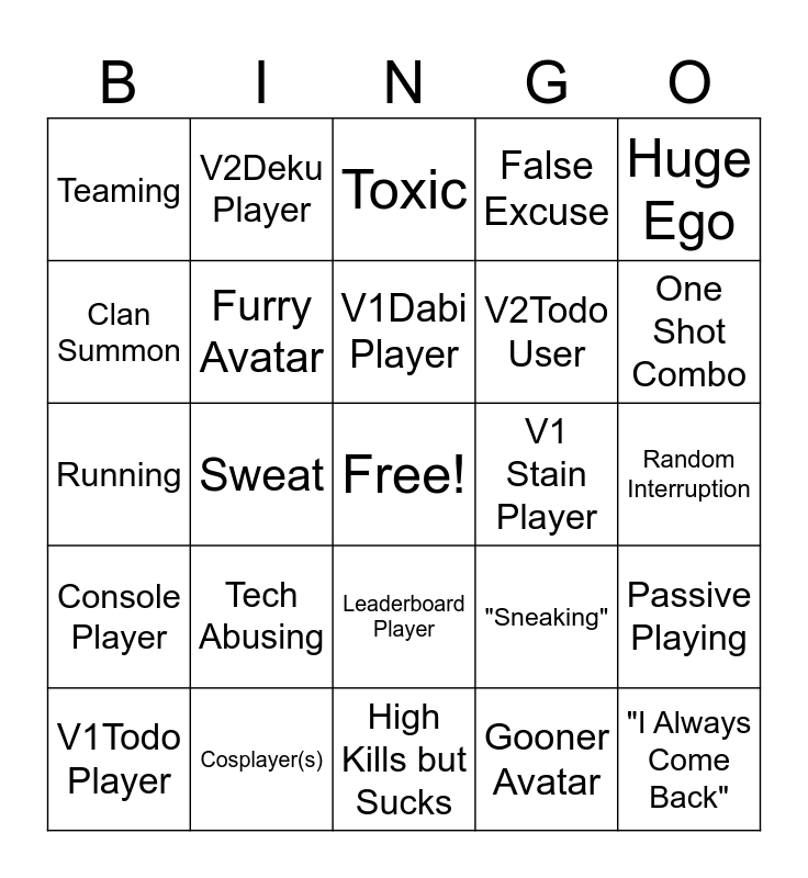 This bingo card has a free space and 24 words: Tech Abusing, Cosplayer(s), V1Dabi Player, V1Todo Player, Huge Ego, Teaming, Clan Summon, V2Deku Player, V1 Stain Player, Leaderboard Player, V2Todo User, Running, "Sneaking", Passive Playing, Furry Avatar, Gooner Avatar, Random Interruption, Toxic, One Shot Combo, Sweat, "I Always Come Back", Console Player, False Excuse and High Kills but Sucks.