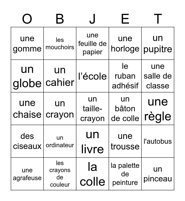 This bingo card has 30 words: les crayons de couleur, les marqueurs, un crayon, les crayons de cire, une gomme, une feuille de papier, un cahier, un livre, un bâton de colle, la colle, une règle, un taille-crayon, la palette de peinture, un pinceau, une salle de classe, une calculatrice, une trousse, des ciseaux, un ordinateur, un pupitre, une chaise, un sac à dos, les mouchoirs, le ruban adhésif, un globe, une horloge, l'autobus, une agrafeuse, l’école and le tableau.