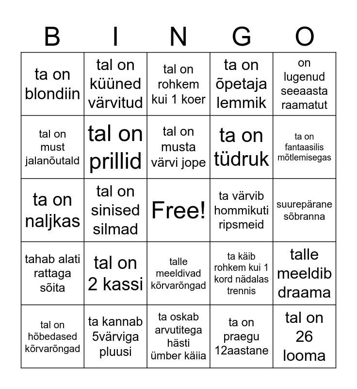 This bingo card has a free space and 24 words: tal on 2 kassi, ta kannab 5värviga pluusi, tal on musta värvi jope, tal on hõbedased kõrvarõngad, on lugenud seeaasta raamatut, ta on blondiin, tal on must jalanõutald, tal on küüned värvitud, ta värvib hommikuti ripsmeid, talle meeldivad kõrvarõngad, ta on tüdruk, ta on naljkas, ta käib rohkem kui 1 kord nädalas trennis, talle meeldib draama, tal on prillid, ta on praegu 12aastane, suurepärane sõbranna, tal on rohkem kui 1 koer, ta on fantaasilis mõtlemisegas, tal on sinised silmad, tal on 26 looma, tahab alati rattaga sõita, ta on õpetaja lemmik and ta oskab arvutitega hästi ümber käiia.