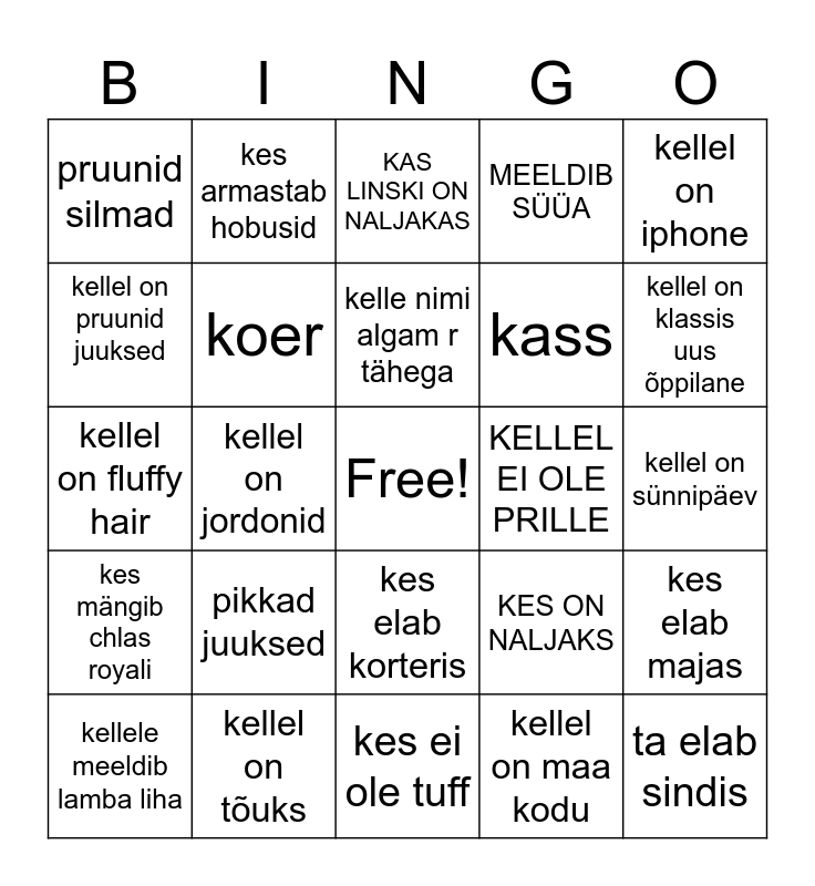 This bingo card has a free space and 24 words: pikkad juuksed, kellel on tõuks, kelle nimi algam r tähega, kellele meeldib lamba liha, kellel on iphone, pruunid silmad, kellel on pruunid juuksed, kes armastab hobusid, KELLEL EI OLE PRILLE, kes elab korteris, kass, kellel on fluffy hair, KES ON NALJAKS, kes elab majas, koer, kellel on maa kodu, kellel on sünnipäev, KAS LINSKI ON NALJAKAS, kellel on klassis uus õppilane, kellel on jordonid, ta elab sindis, kes mängib chlas royali, MEELDIB SÜÜA and kes ei ole tuff.