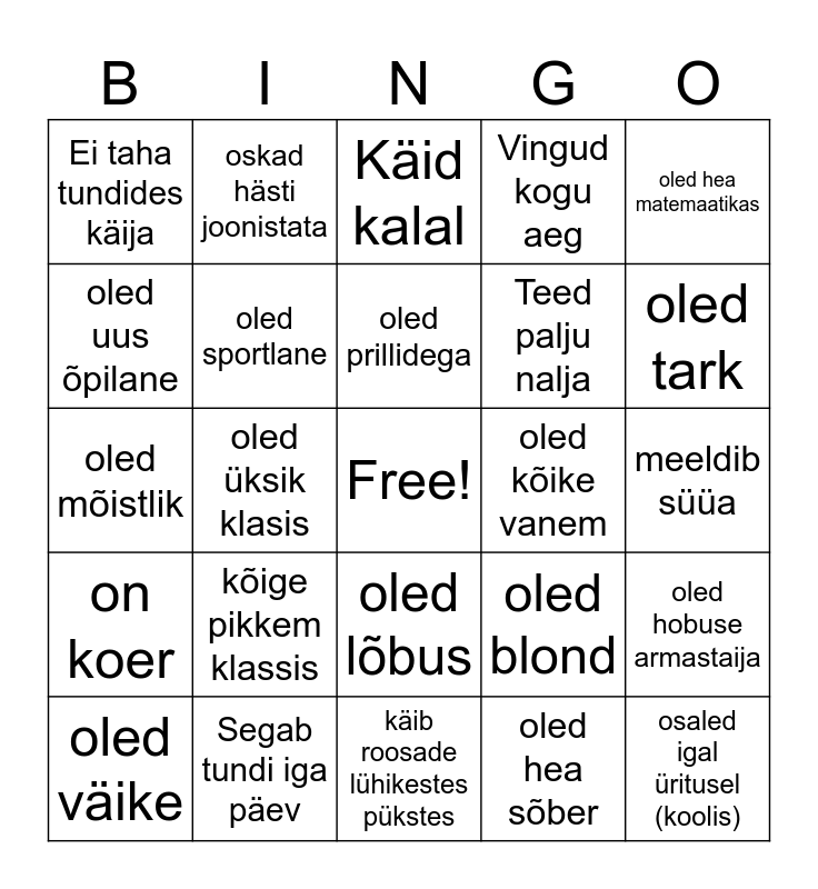 This bingo card has a free space and 24 words: kõige pikkem klassis, Segab tundi iga päev, oled prillidega, oled väike, oled hea matemaatikas, Ei taha tundides käija, oled uus õpilane, oskad hästi joonistata, oled kõike vanem, oled lõbus, Teed palju nalja, oled mõistlik, oled blond, oled hobuse armastaija, oled sportlane, oled hea sõber, meeldib süüa, Käid kalal, oled tark, oled üksik klasis, osaled igal üritusel (koolis), on koer, Vingud kogu aeg and käib roosade lühikestes pükstes.