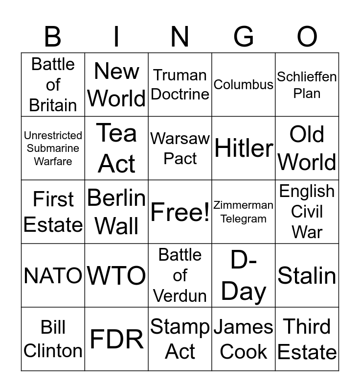 This bingo card has a free space and 24 words: WTO, FDR, Warsaw Pact, Bill Clinton, Schlieffen Plan, Battle of Britain, Unrestricted Submarine Warfare, New World, Zimmerman Telegram, Battle of Verdun, Hitler, First Estate, D-Day, Stalin, Tea Act, James Cook, English Civil War, Truman Doctrine, Old World, Berlin Wall, Third Estate, NATO, Columbus and Stamp Act.
