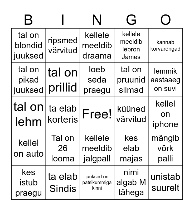 This bingo card has a free space and 24 words: Tal on 26 looma, ta elab Sindis, loeb seda praegu, kes istub praegu, kannab kõrvarõngad, tal on blondid juuksed, tal on pikad juuksed, ripsmed värvitud, küüned värvitud, kellele meeldib jalgpall, tal on pruunid silmad, tal on lehm, kes elab majas, mängib võrk palli, tal on prillid, nimi algab M tähega, kellel on iphone, kellele meeldib draama, lemmik aastaaeg on suvi, ta elab korteris, unistab suurelt, kellel on auto, kellele meeldib lebron James and juuksed on patsikummiga kinni.