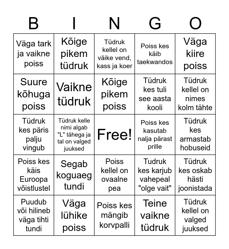 This bingo card has a free space and 24 words: Segab koguaeg tundi, Väga lühike poiss, Kõige pikem poiss, Puudub või hilineb väga tihti tundi, Väga kiire poiss, Väga tark ja vaikne poiss, Suure kõhuga poiss, Kõige pikem tüdruk, Poiss kes kasutab nalja pärast prille, Poiss kellel on ovaalne pea, Tüdruk kes tuli see aasta kooli, Tüdruk kes päris palju vingub, Tudruk kes karjub vahepeal "olge vait", Tüdruk kes oskab hästi joonistada, Vaikne tüdruk, Teine vaikne tüdruk, Tüdruk kes armastab hobuseid, Tüdruk kellel on väike vend, kass ja koer, Tüdruk kellel on nimes kolm tähte, Tüdruk kelle nimi algab "L" tähega ja tal on valged juuksed, Tüdruk kellel on valged juuksed, Poiss kes käis Euroopa võistlustel, Poiss kes käib taekwandos and Poiss kes mängib korvpalli.
