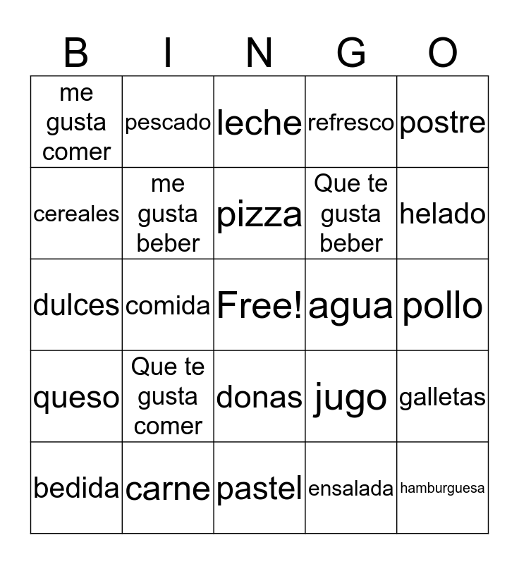 This bingo card has a free space and 24 words: Que te gusta comer, carne, pizza, bedida, postre, me gusta comer, cereales, pescado, agua, donas, Que te gusta beber, dulces, jugo, galletas, me gusta beber, ensalada, pollo, leche, helado, comida, hamburguesa, queso, refresco and pastel.