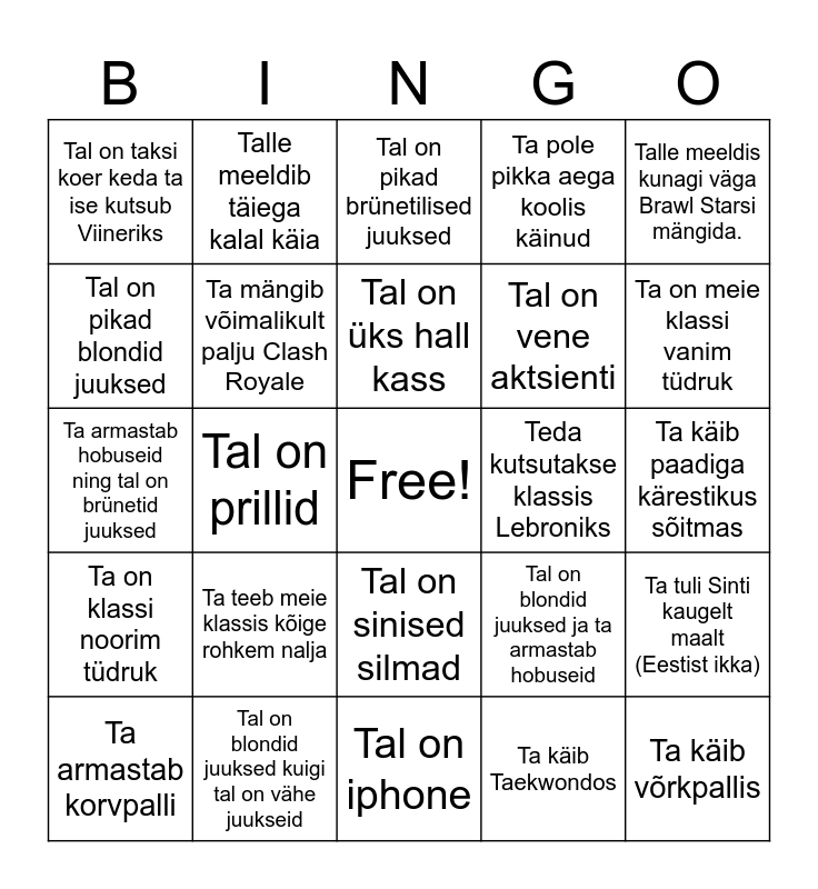 This bingo card has a free space and 24 words: Ta teeb meie klassis kõige rohkem nalja, Tal on blondid juuksed kuigi tal on vähe juukseid, Tal on üks hall kass, Ta armastab korvpalli, Talle meeldis kunagi väga Brawl Starsi mängida., Tal on taksi koer keda ta ise kutsub Viineriks, Tal on pikad blondid juuksed, Talle meeldib täiega kalal käia, Teda kutsutakse klassis Lebroniks, Tal on sinised silmad, Tal on vene aktsienti, Ta armastab hobuseid ning tal on brünetid juuksed, Tal on blondid juuksed ja ta armastab hobuseid, Ta tuli Sinti kaugelt maalt (Eestist ikka), Ta mängib võimalikult palju Clash Royale, Ta käib Taekwondos, Ta käib paadiga kärestikus sõitmas, Tal on pikad brünetilised juuksed, Ta on meie klassi vanim tüdruk, Tal on prillid, Ta käib võrkpallis, Ta on klassi noorim tüdruk, Ta pole pikka aega koolis käinud and Tal on iphone.