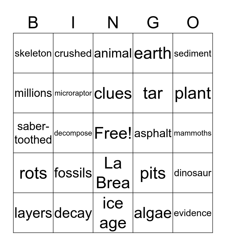 This bingo card has a free space and 24 words: fossils, decay, clues, layers, sediment, skeleton, millions, crushed, asphalt, La Brea, tar, saber- toothed, pits, dinosaur, microraptor, algae, mammoths, animal, plant, decompose, evidence, rots, earth and ice age.
