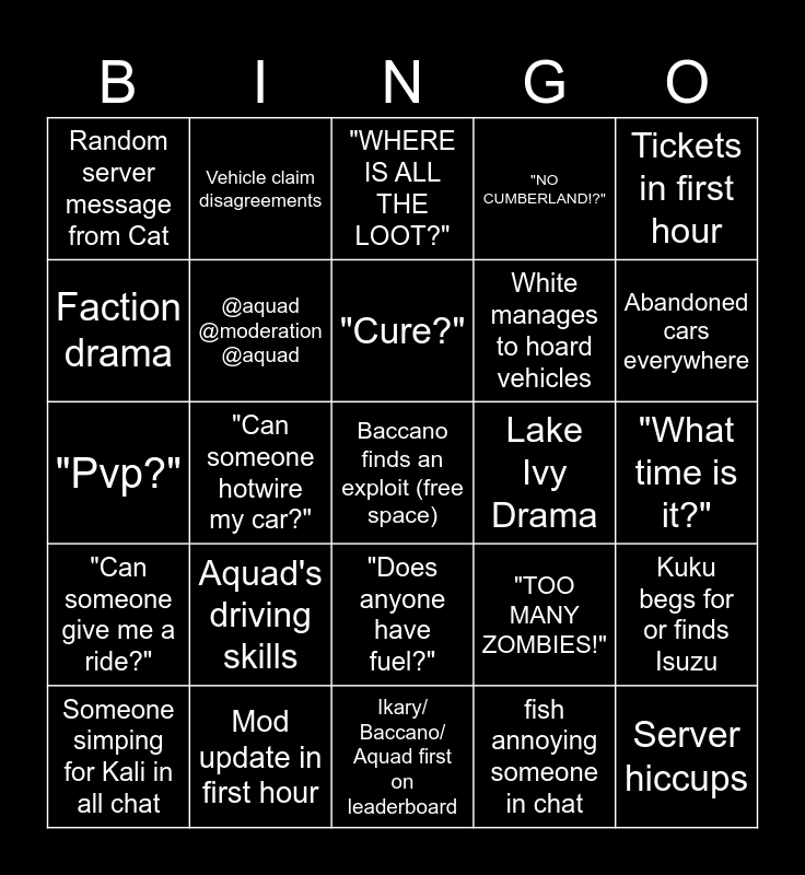 This bingo card has a free space and 24 words: Aquad's driving skills, Mod update in first hour, "Cure?", Someone simping for Kali in all chat, Tickets in first hour, Random server message from Cat, Faction drama, Vehicle claim disagreements, Lake Ivy Drama, "Does anyone have fuel?", White manages to hoard vehicles, "Pvp?", "TOO MANY ZOMBIES!", Kuku begs for or finds Isuzu, @aquad @moderation @aquad, fish annoying someone in chat, "What time is it?", "WHERE IS ALL THE LOOT?", Abandoned cars everywhere, "Can someone hotwire my car?", Server hiccups, "Can someone give me a ride?", "NO CUMBERLAND!?" and Ikary/ Baccano/ Aquad first on leaderboard.